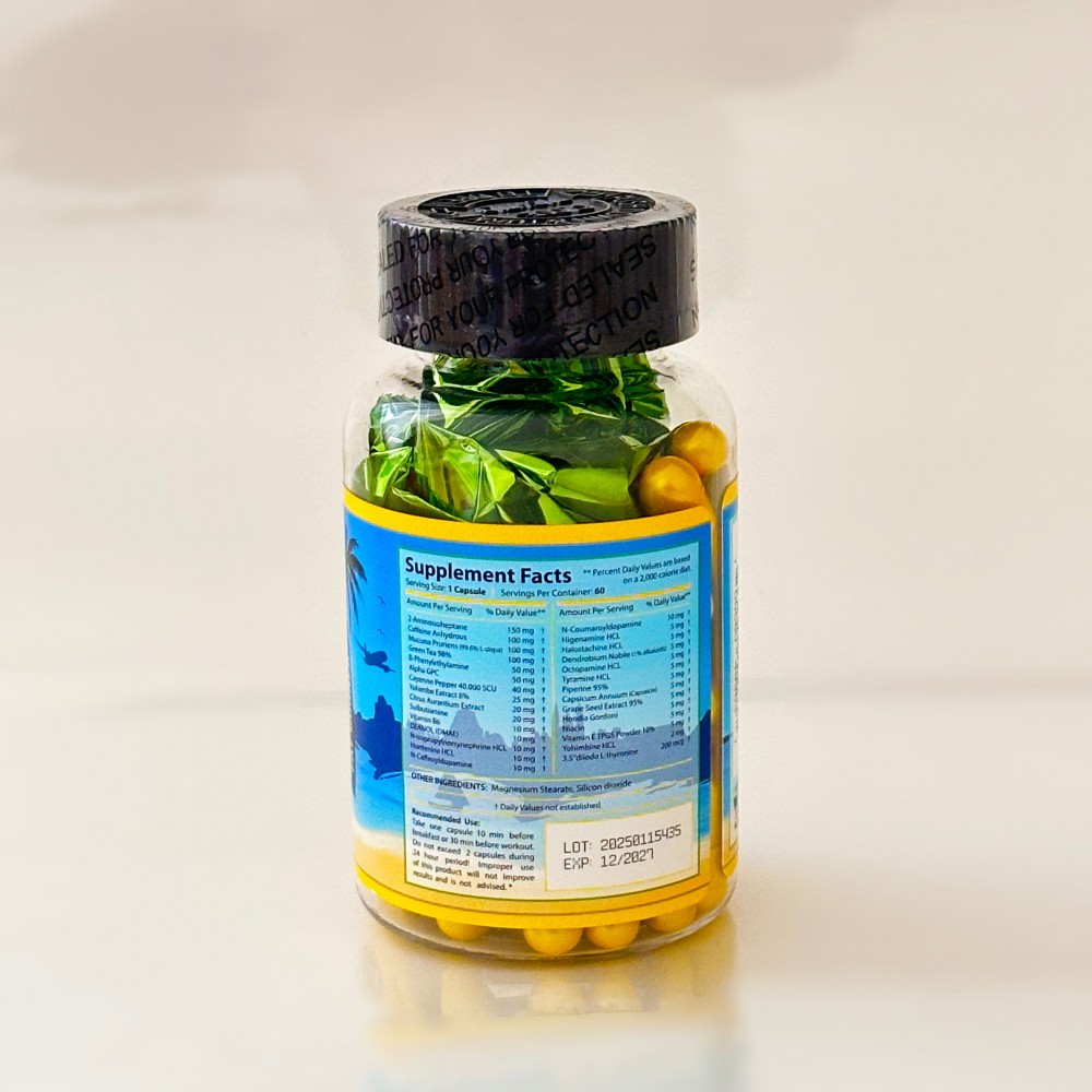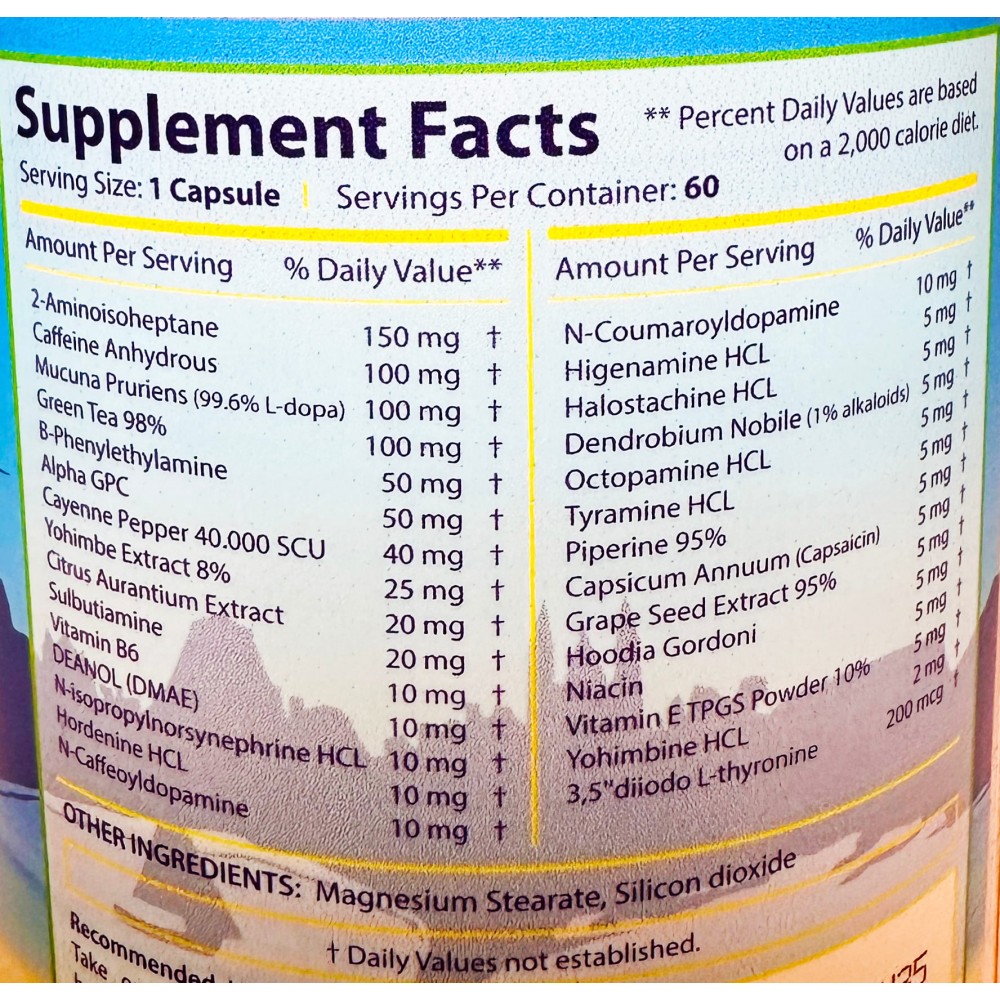 mucuna pruriens, beta-phenylethylamine, AMP citrate, green tea extract, cayenne pepper, yohimbine extract, bitter orange, anhydrous caffeine, alpha glycerylphosphorylcholine, sulbutiamine, vitamin B6, dimethylaminoethanol (DMAE), hordenine hydrochloride, n-caffeoyldopamine, synephrine hydrochloride, n-coumaroyldopamine, higenamine hydrochloride, dendrobium, octopamine hydrochloride, tyramine hydrochloride, halostachine hydrochloride, 95% piperine, capsaicin, hoodia gordonii, niacin, 95% grape seed extract, vitamin E, yohimbine hydrochloride, 3,5-diiodothyronine.
