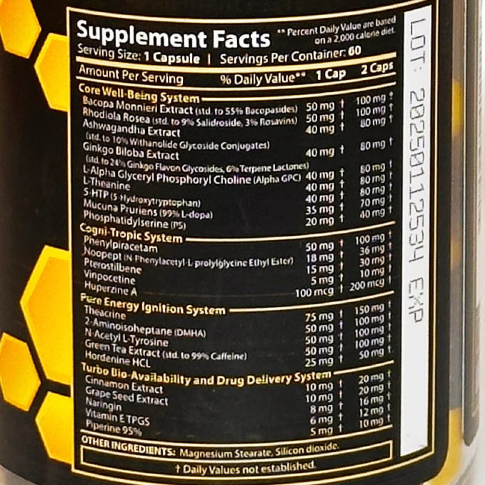 Когнитивная поддержка: Alpha GPC, гинкго билоба, фенилпирацетам, ноопепт и гуперзин A способствуют улучшению памяти, концентрации, скорости мышления и нейронной активности.