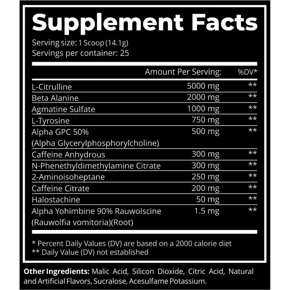 500 мг кофеїну + DMHA + Eria Jarensis + Alpha-Yo — ця формула виводить ЦНС на космічний рівень стимуляції, а 5 г цитруліну + 1 г агматина дають божевільний памп та витривалість. Тільки для тих, хто готовий до межі!