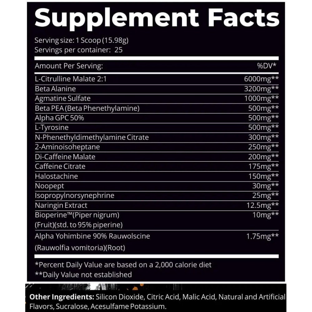 Надпотужний передтренувальний комплекс для спортсменів, які добре переносять високу стимуляцію. Формула об’єднує сильні NO-донатори, бета-аланін та групу ефективних стимуляторів ЦНС, що забезпечують максимальний енергетичний імпульс, концентрований фокус і високу тренувальну інтенсивність. Продукт орієнтований на атлетів з досвідом використання потужних стимулюючих добавок. Новачкам цей комплекс не рекомендується.
