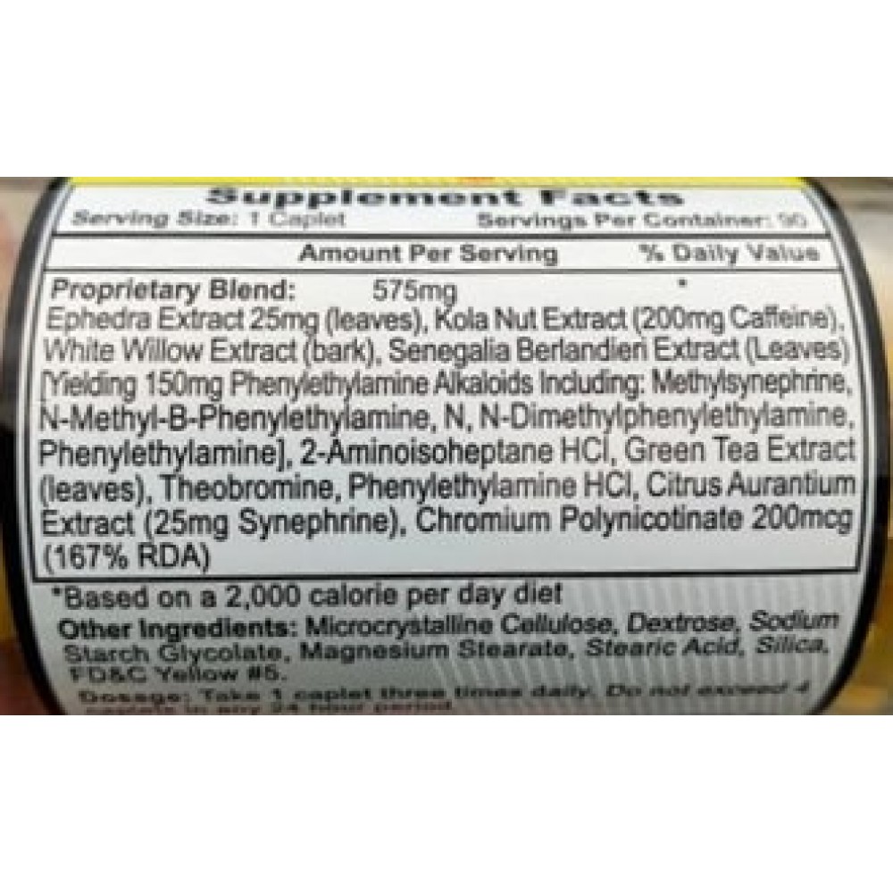 Класичний ECA стек (ефедра, кофеїн, кора білої верби) + 1,3-DMAA та фенілетиламін (PEA) створюють синергію для термогенезу, вивільнення жирних кислот та прискорення метаболізму. Кора білої верби замінює аспірин для безпеки шлунку.